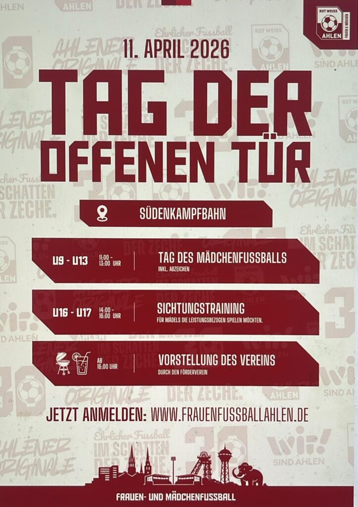 Am 11. April öffnet die Frauen- und Mädchenfußballabteilung von Rot Weiss Ahlen ihre Türen und lädt alle Interessierten herzlich auf die Sportanlage ein. Willkommen sind Spielerinnen, Eltern, potenzielle Trainerinnen und Trainer sowie alle, die sich für den Frauen- und Mädchenfußball in Ahlen interessieren.